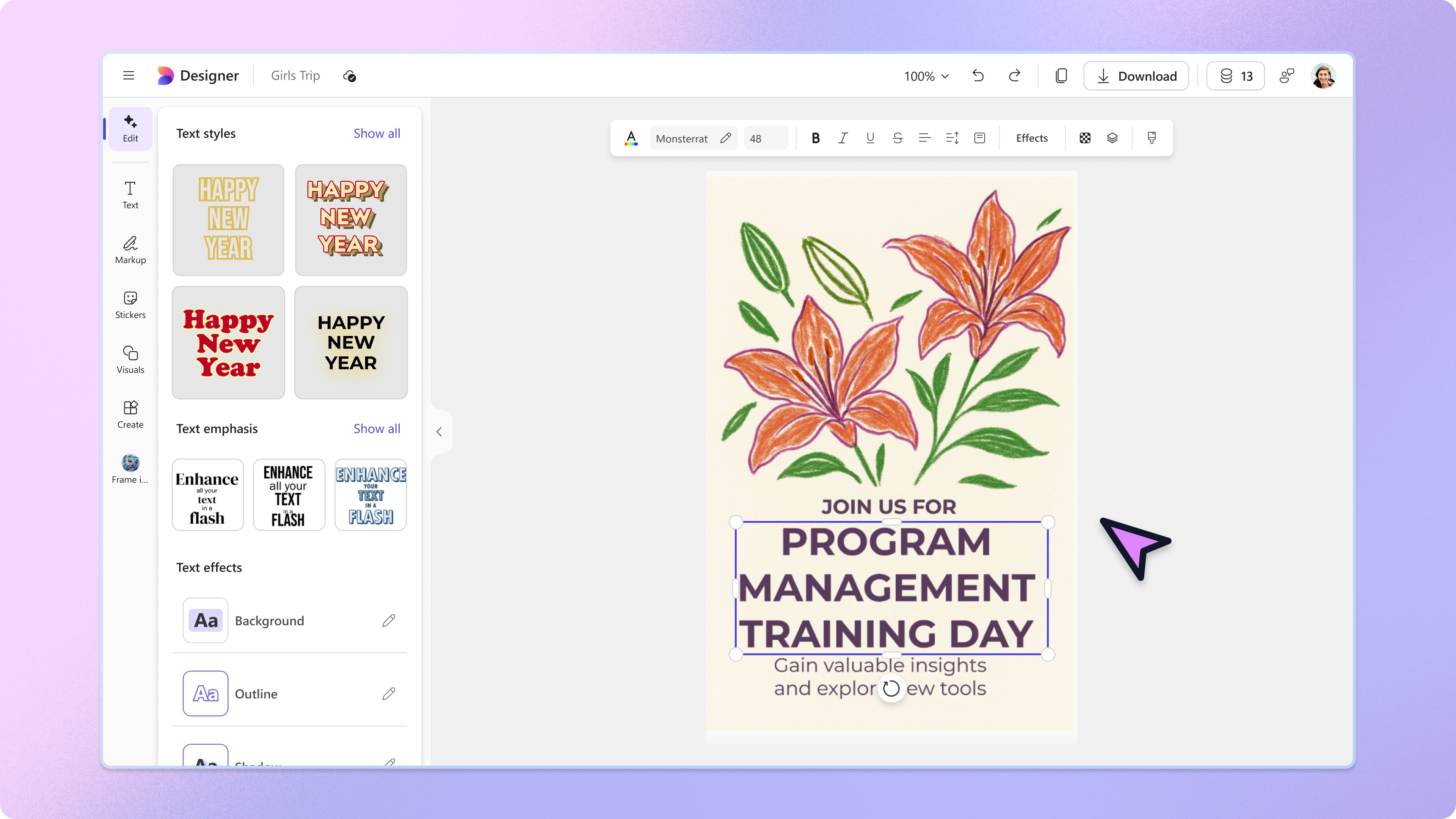 Using a mixture of prompt engineering and art direction, I created over 150 prompt templates with style and intent combinations ranging from our most popular template categories to improve our design template quality and increase user retention. These prompt templates were then transformed into over 7,500 design template library by our ML team using generative AI models.